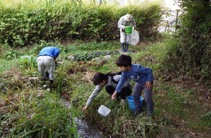 写真1庄内ほたる水路で生き物の採集風景。