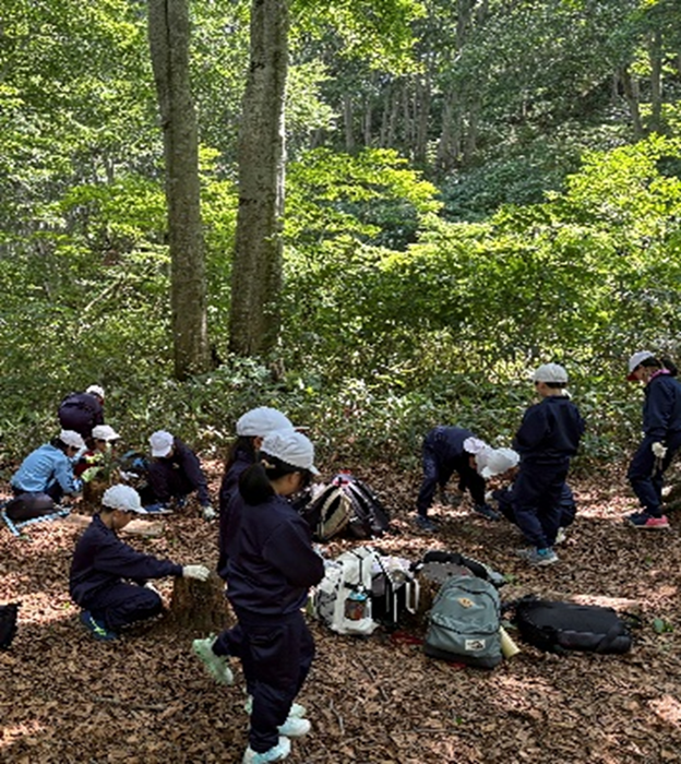 小学校高学年は、信越トレイルを中心に歩くコース設定。今年の5学年は関田峠近くにある茶屋池周遊の遊歩道を使用してフィールドワークを行なった。道中、木の実や葉っぱを使った作品作りなど子供でも楽しんで自然に触れ合える機会とした。
