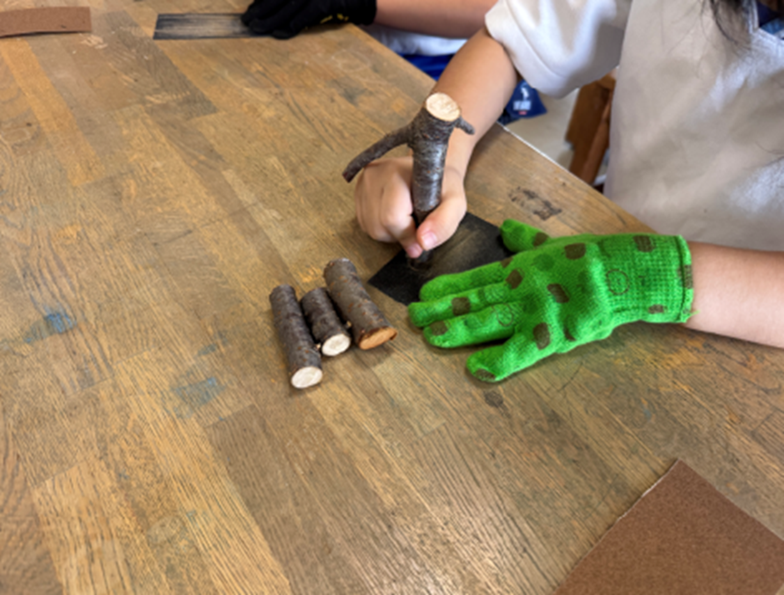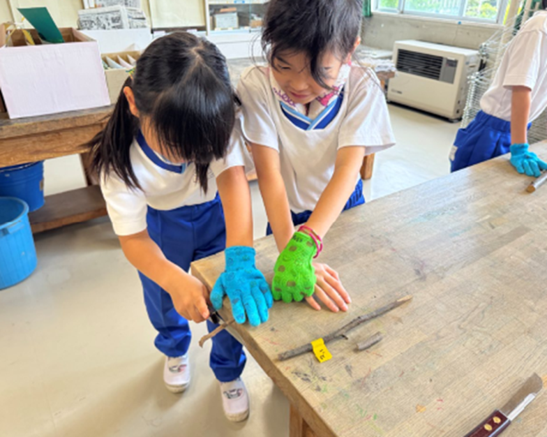 学校の図工室で、学校の枝を使ってキーホルダーを作りました。のこぎりの使い方を覚え、実際の木を切りました。また、紙やすりで磨き、木の香りを感じることができました。紐をつけて目玉をつけ、キーホルダーにしました。