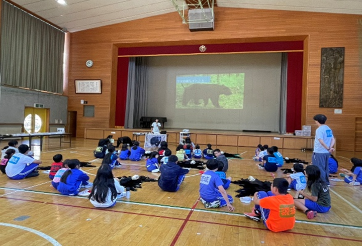 1,5,6年生児童を対象にクマ授業を行いました。前半はクイズなどを交え、実際に骨や毛皮を触りながら、クマの体、生態、暮らし、出会わないために知っておきたいこと、出会った時にどうするか、について学びました。後半のかるた大会は、授業の振り返りができるよう、テーマごとに読み札を読み上げ、楽しく学びました。