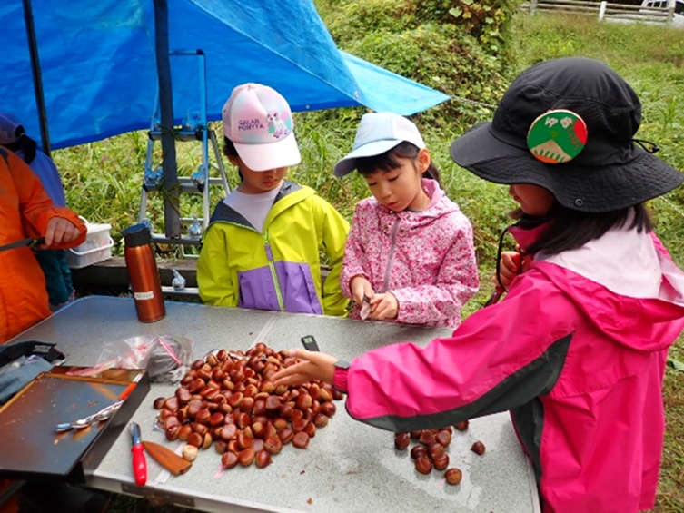 鎌を使って稲刈り→わらで縛る→はざかけをする。という手作業での稲刈り作業を通じて、道具の使い方、共同で作業する重要性を学びました。また、栗がたくさん落ちていたので、栗拾いをし、焚火をして、焼きリンゴと焼き栗を作り、秋の味覚を楽しみました。ここで収穫した米は、11月の収穫祭で味わいます。