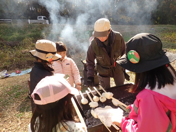 たき火で10月にビオトープで収穫した新米を炊いて、五平餅とおにぎりを作って食べました。
